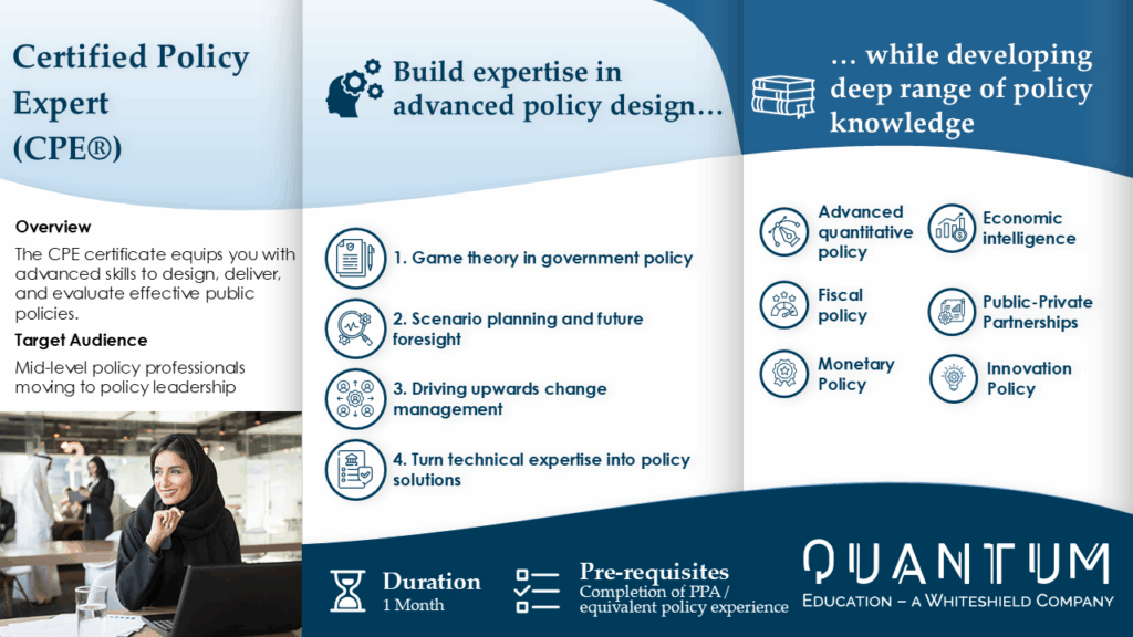 Embark on a transformative journey with the CPE® – Certified Policy Expert program. Open to all who aspire to refine their policy-making skills, this comprehensive course covers the foundations of public policy, stakeholder engagement, and strategic implementation. Enhance your employability and expertise through practical evaluations and a real-world Capstone Project. Aim high, obtain the designation, and redefine your career path.