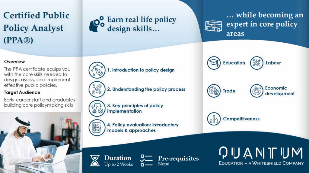 Embark on a transformative journey with the PPA® – Certified Public Policy Analyst program. Open to all who aspire to refine their policy-making skills, this comprehensive course covers the foundations of public policy, including design and strategic implementation. Enhance your employability and expertise. Aim high, obtain the designation, and redefine your career path.